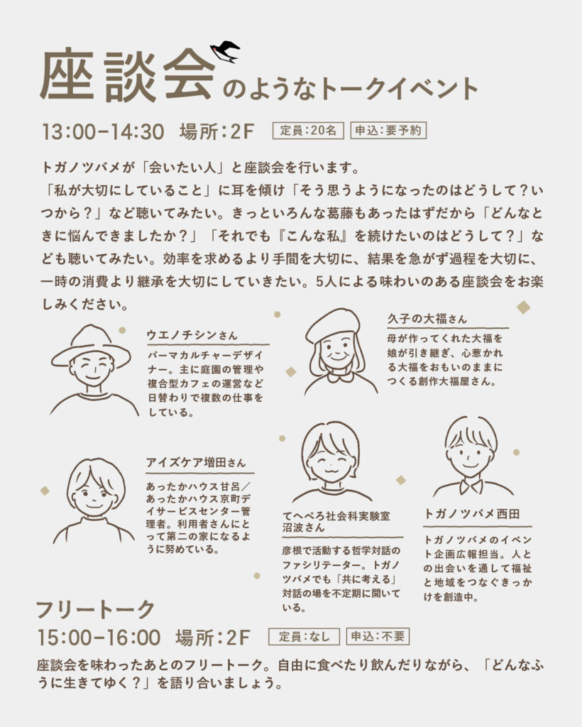 滋賀県彦根市で株式会社アイズケアが運営する、カフェを併設し、デイサービスや居宅介護支援事業所、シェアスペースの拠点、「トガノツバメ」では、2周年を迎えるにあたり、「ツバメたちの讌会」と題して、マルシェや体験コーナー、トークイベントなどを交えた催しが実施されます。
