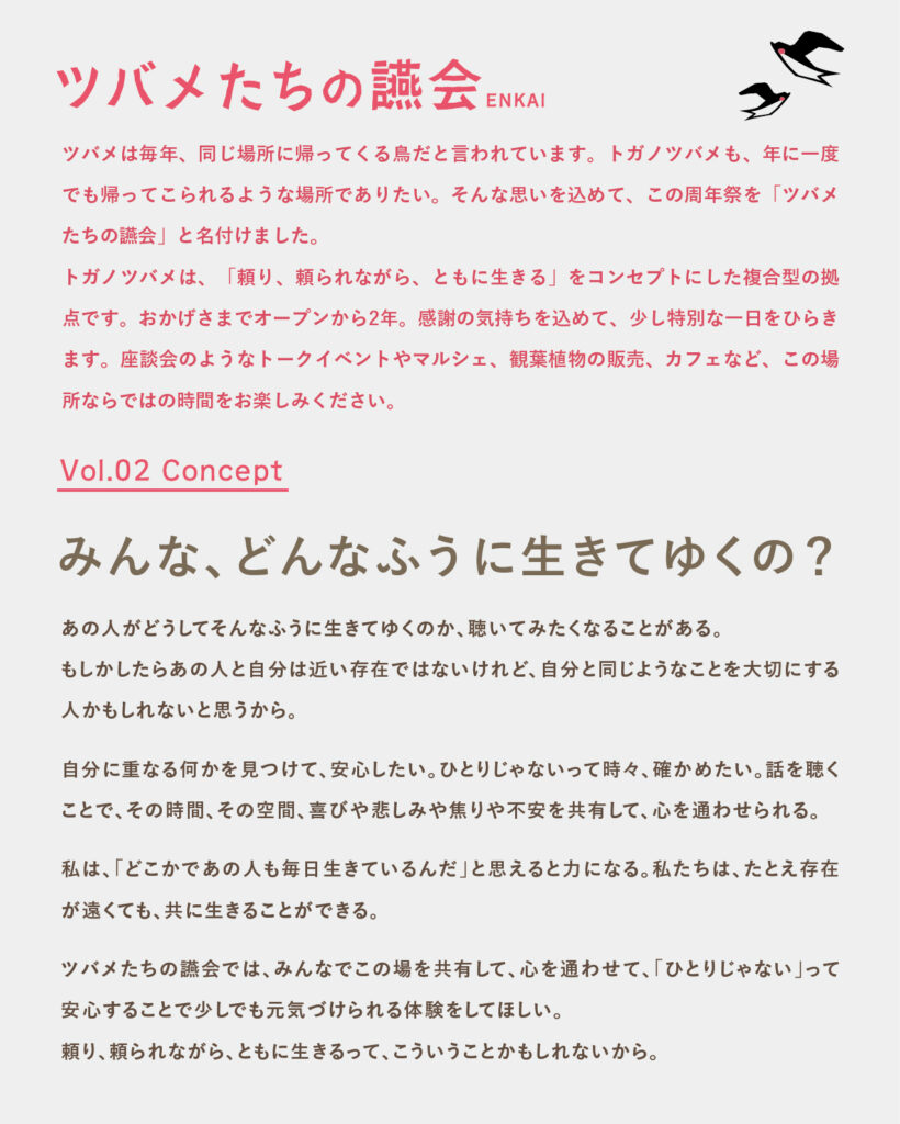 ツバメは毎年、同じ場所に帰ってくる鳥だと言われています。トガノツバメも、年に一度でも帰ってこられるような場所でありたい。そんな思いを込めて、この周年祭を「ツバメたちの讌会」と名付けました。