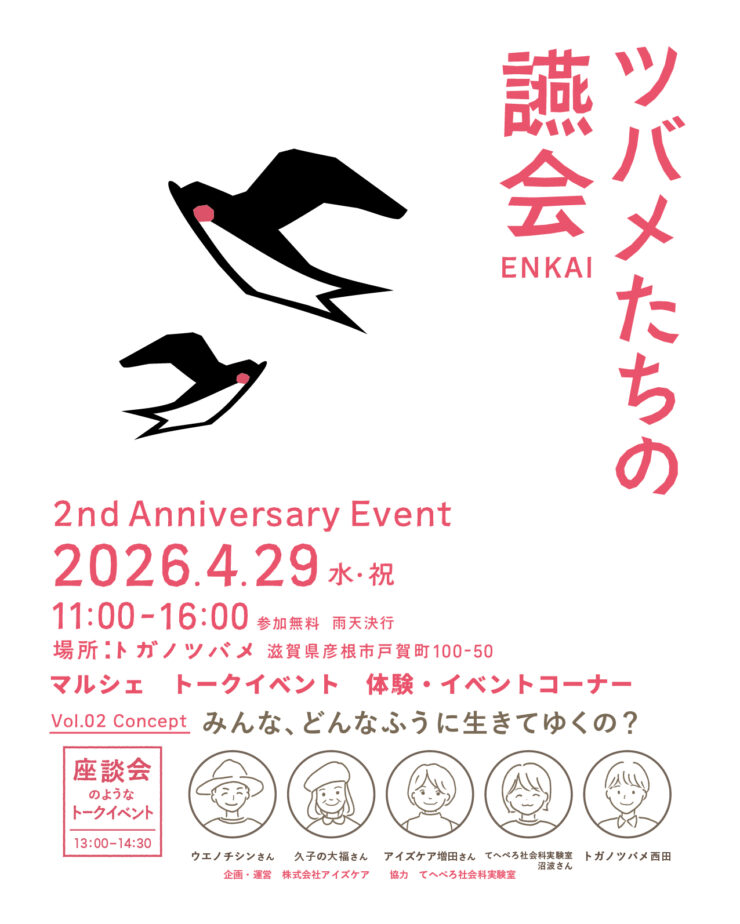 滋賀県彦根市で株式会社アイズケアが運営する、カフェを併設し、デイサービスや居宅介護支援事業所、シェアスペースの拠点、「トガノツバメ」では、2周年を迎えるにあたり、「ツバメたちの讌会」と題して、マルシェや体験コーナー、トークイベントなどを交えた催しが実施されます。